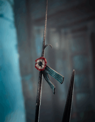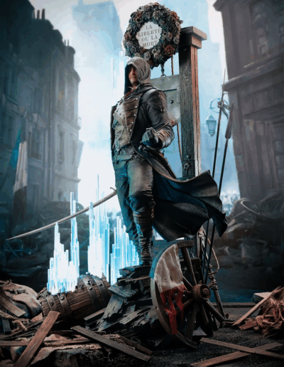 Arno se alza sobre los escombros y restos del levantamiento con su espada en una mano y la ballesta de la Hoja Fantasma en la otra, mientras detrás de él se erige una guillotina desgastada coronada con una corona de flores y la desafiante inscripción: “La liberté ou la mort.” A sus pies, una bandera francesa desgarrada refleja el caos de la época.