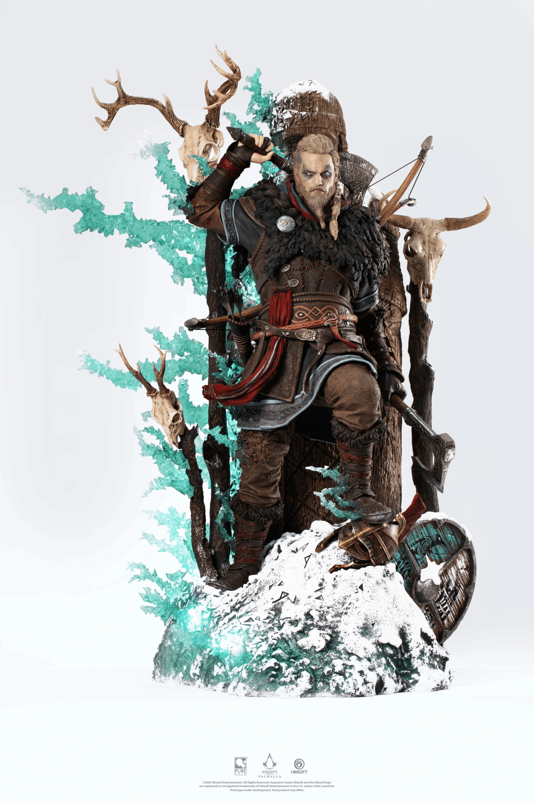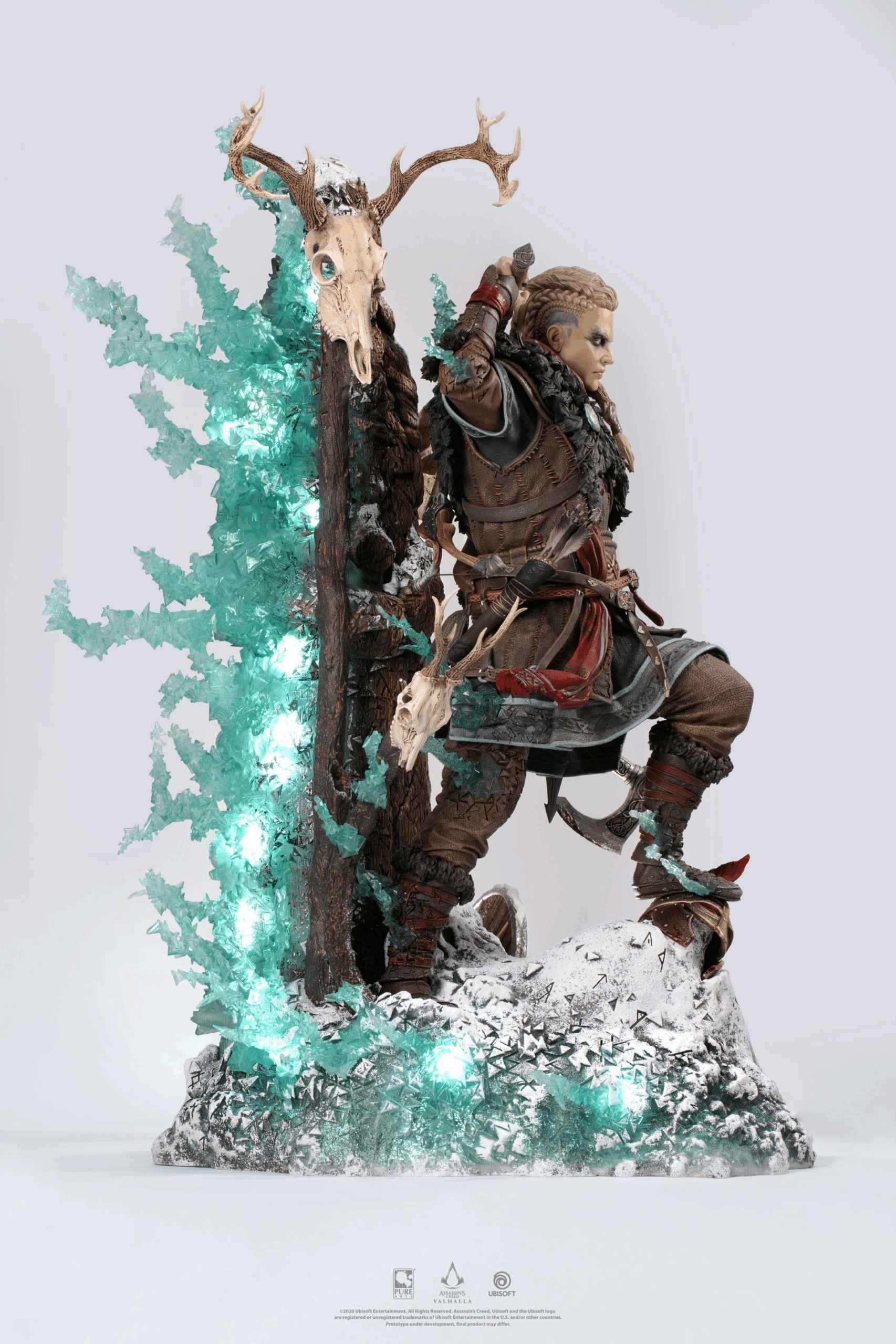 Representado frente a un tótem del dios Odín, con sus hachas listas para la gloria y la batalla, esta estatua de poliresina a escala 1/4 ofrece un nivel de detalle sobresaliente. Incluye el icónico Hidden Blade visible en su antebrazo y un sistema de luces LED integradas en el efecto Animus de resina translúcida turquesa.
