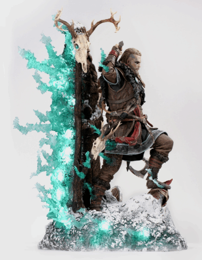 Representado frente a un tótem del dios Odín, con sus hachas listas para la gloria y la batalla, esta estatua de poliresina a escala 1/4 ofrece un nivel de detalle sobresaliente. Incluye el icónico Hidden Blade visible en su antebrazo y un sistema de luces LED integradas en el efecto Animus de resina translúcida turquesa.