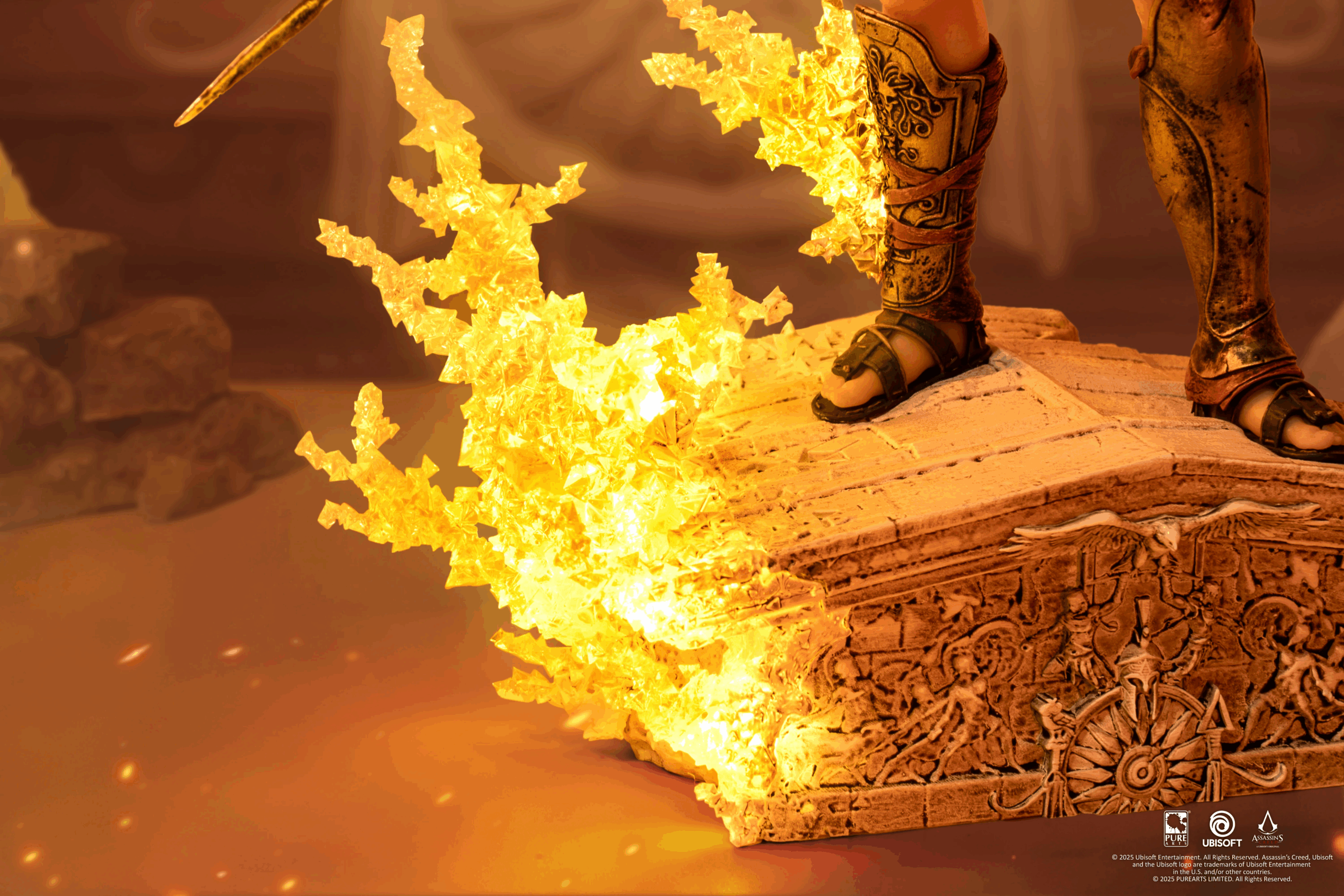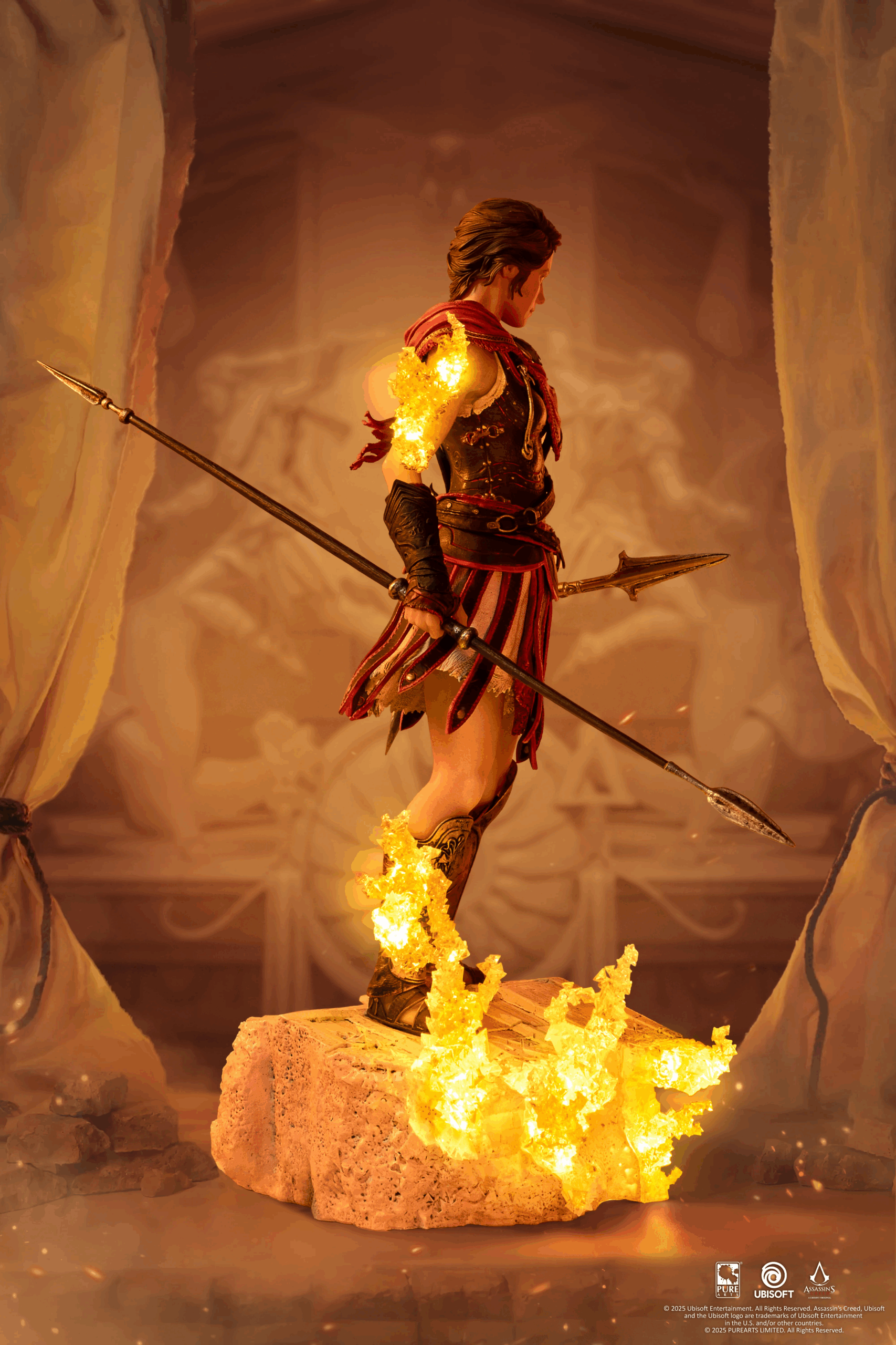 La estatua de Kassandra en escala 1/8 rinde homenaje a la letal mercenaria espartana y protagonista de Assassin’s Creed Odyssey. Con su atuendo de batalla de misthios y la lanza rota en mano, se alza sobre una base inspirada en la Antigua Grecia que incluye grabados de Alexios en combate. A su lado izquierdo aparece el característico efecto Animus iluminado con LED, representando el puente entre pasado y presente.