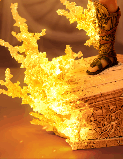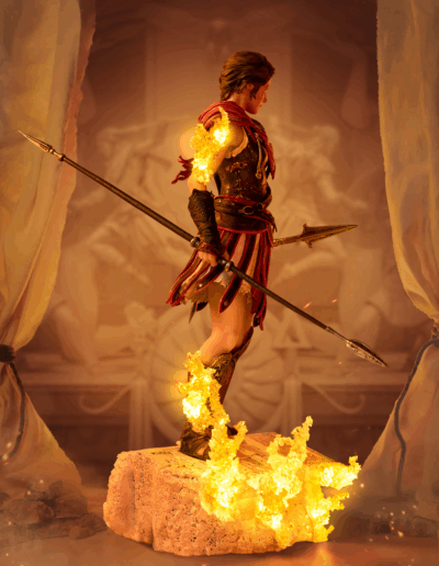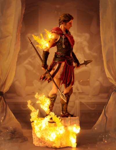 La estatua de Kassandra en escala 1/8 rinde homenaje a la letal mercenaria espartana y protagonista de Assassin’s Creed Odyssey. Con su atuendo de batalla de misthios y la lanza rota en mano, se alza sobre una base inspirada en la Antigua Grecia que incluye grabados de Alexios en combate. A su lado izquierdo aparece el característico efecto Animus iluminado con LED, representando el puente entre pasado y presente.