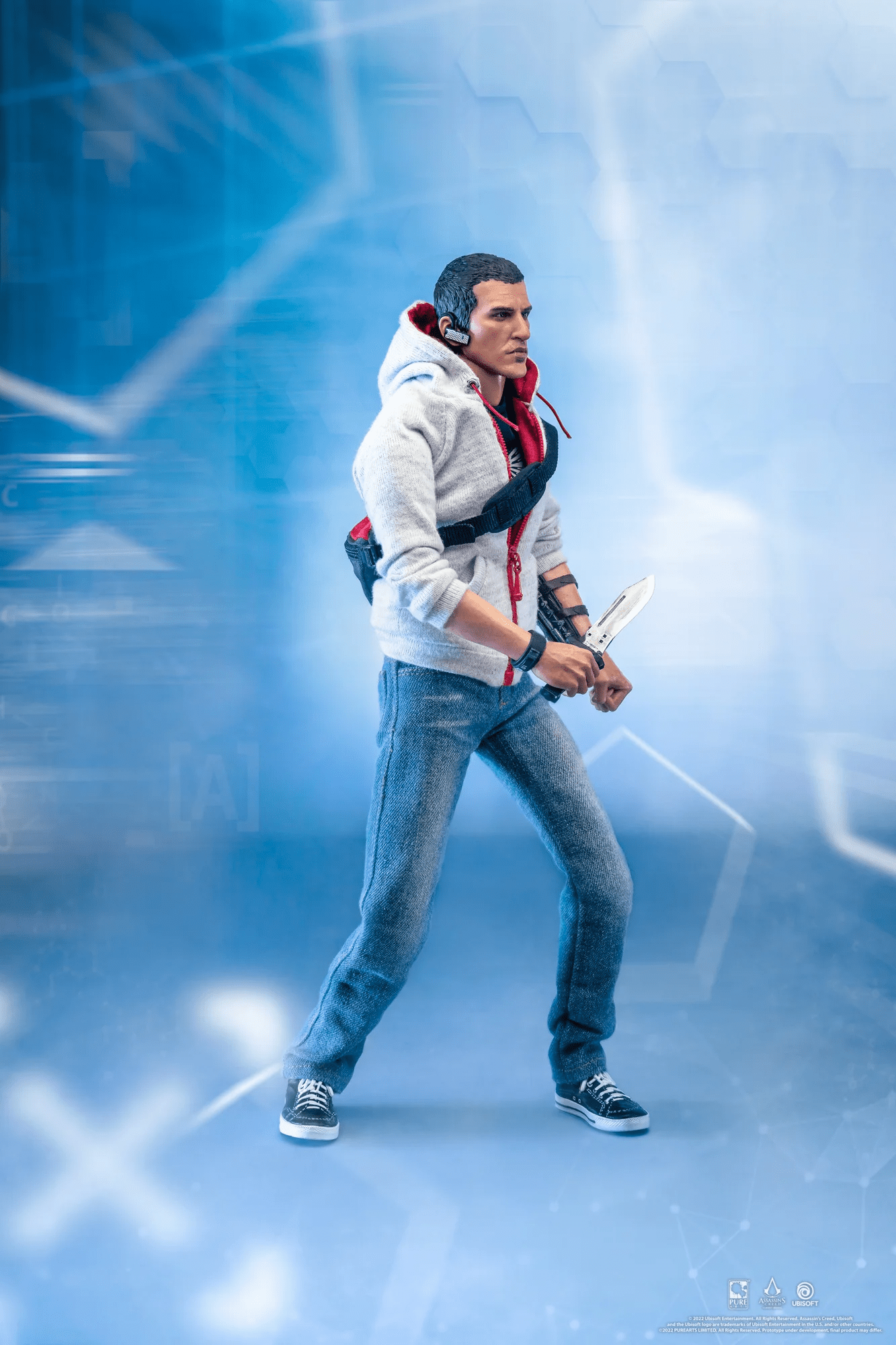 La figura articulada Deluxe 1/6 presenta a Desmond Miles con su atuendo final de Assassin’s Creed III e incluye múltiples armas y accesorios, entre ellos la Hoja Oculta, pistola con supresor, cuchillo, reloj, mochila, auricular y la Manzana del Edén con iluminación LED.