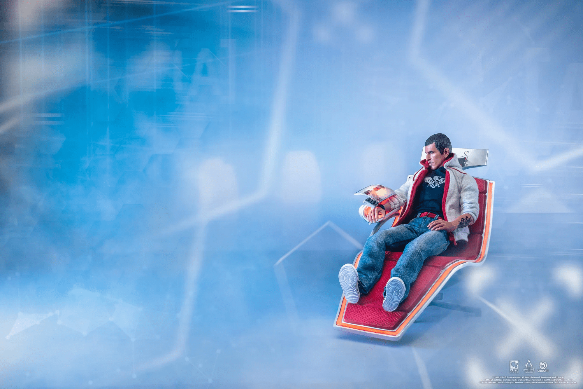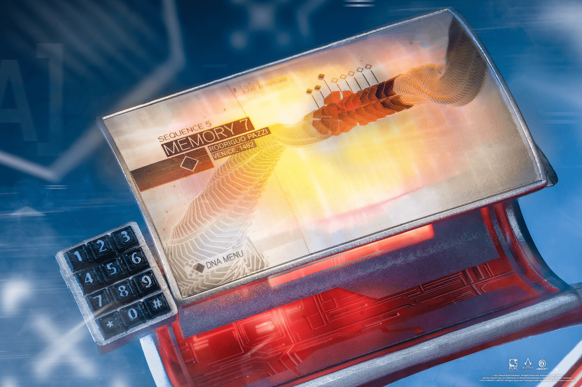 Además, se incorpora una réplica detallada de la silla Animus 2.0 de Assassin’s Creed II y Brotherhood, con luz LED en el escáner del brazo y contorno exterior. La base de exhibición incluye un secreto: usa la lámpara UV incluida para revelar un mensaje oculto en Visión de Águila.