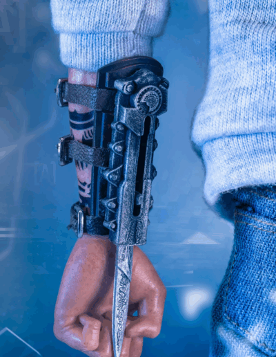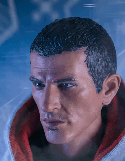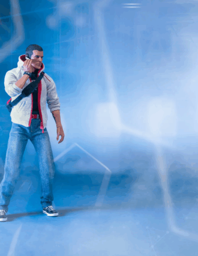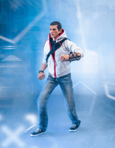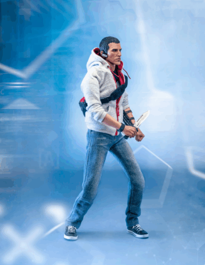 La figura articulada Deluxe 1/6 presenta a Desmond Miles con su atuendo final de Assassin’s Creed III e incluye múltiples armas y accesorios, entre ellos la Hoja Oculta, pistola con supresor, cuchillo, reloj, mochila, auricular y la Manzana del Edén con iluminación LED.