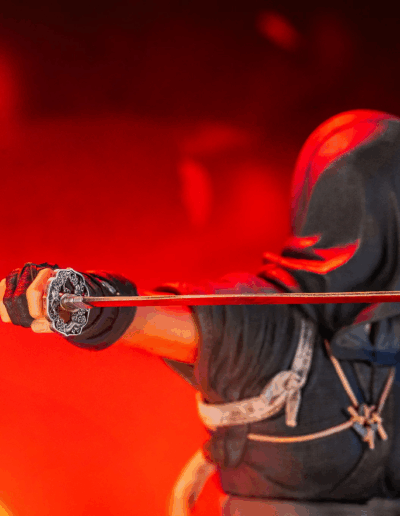 Con sus katanas desenvainadas, ambos están listos para enfrentar cualquier desafío. Naoe se posa con sigilo sobre la cornisa de un elaborado tejado tenshu, armada con su Hoja Oculta para defender su legado, mientras Yasuke transmite toda su fuerza y poder. Juntos, anuncian el inicio de una nueva era para Japón.