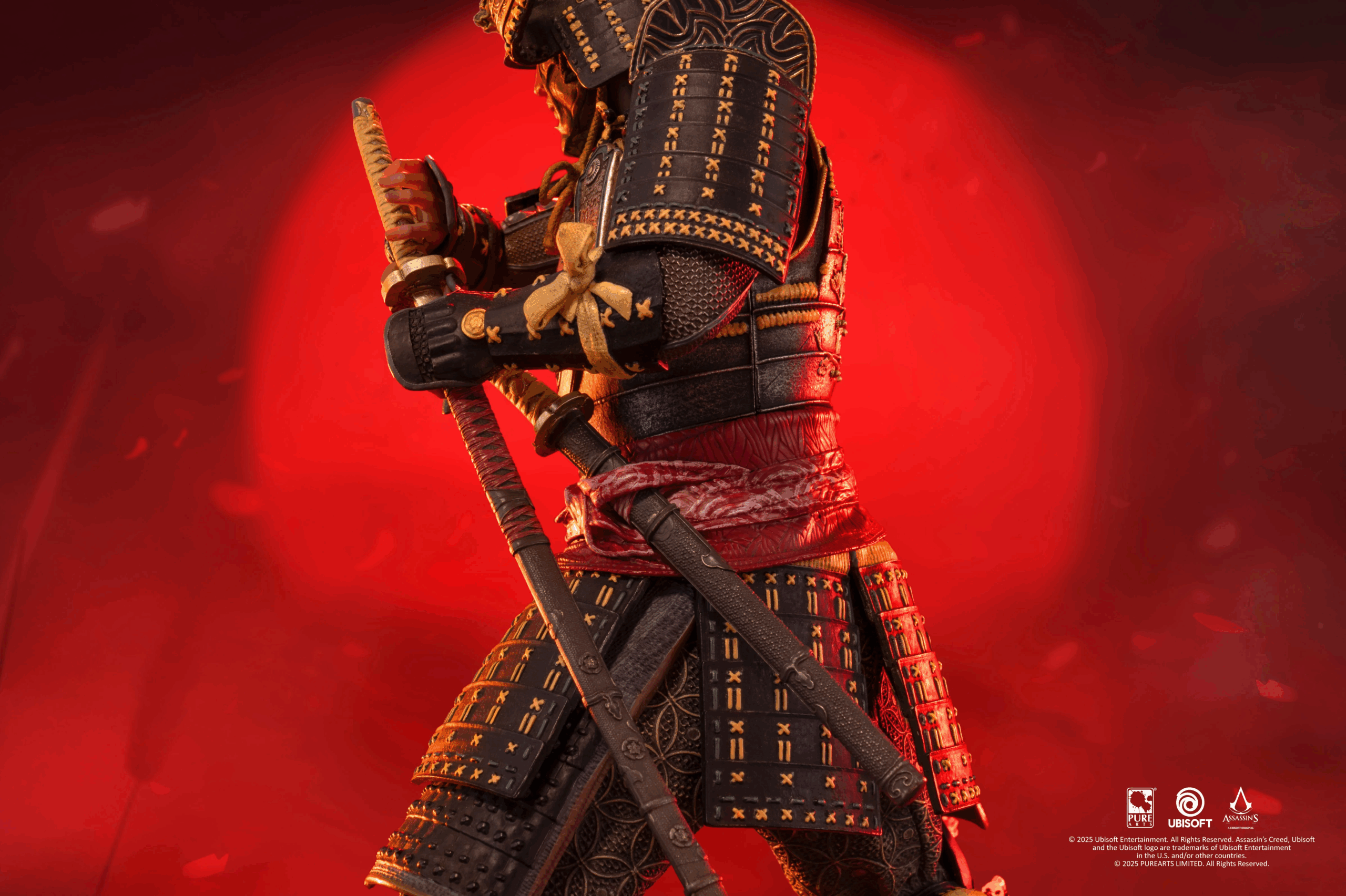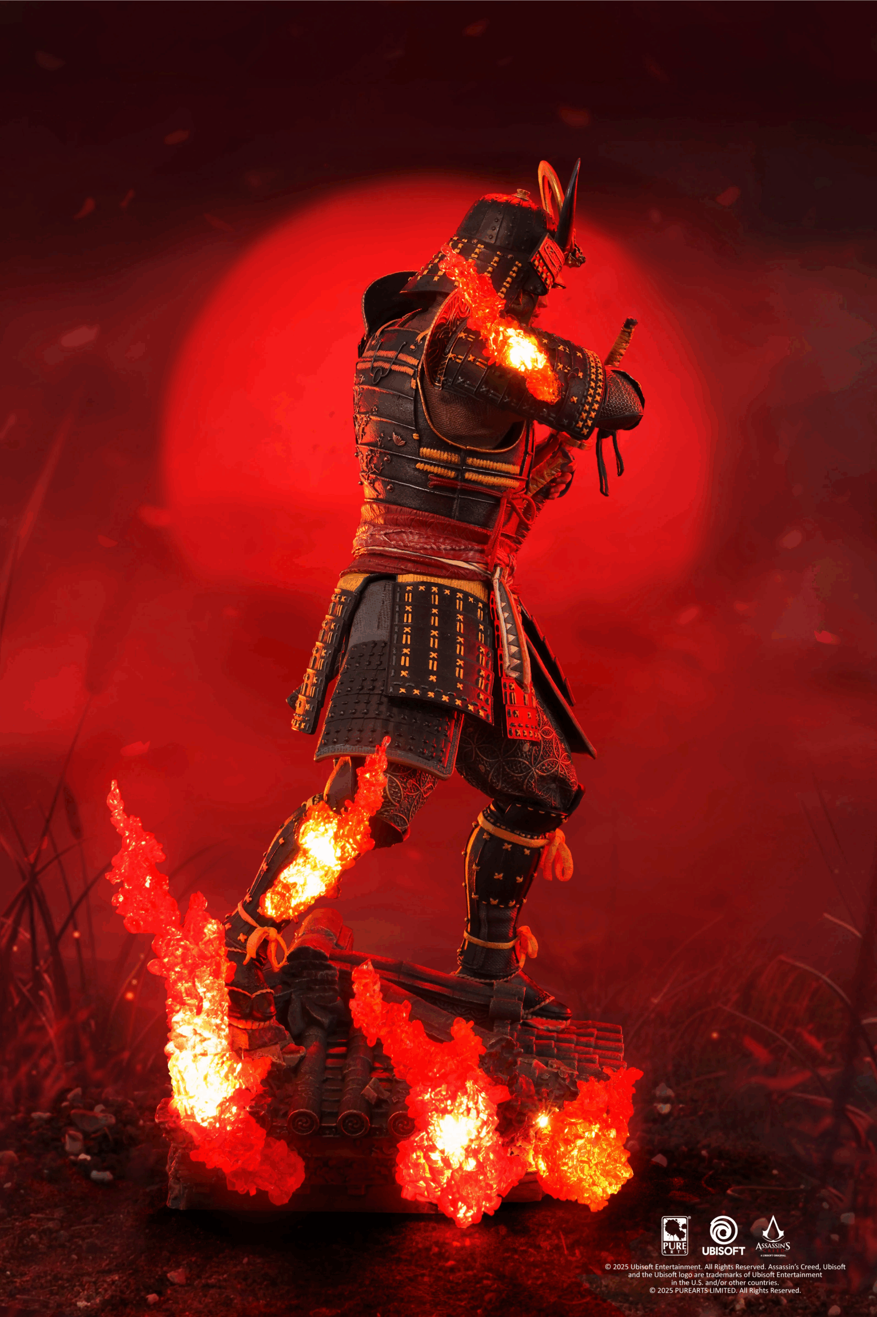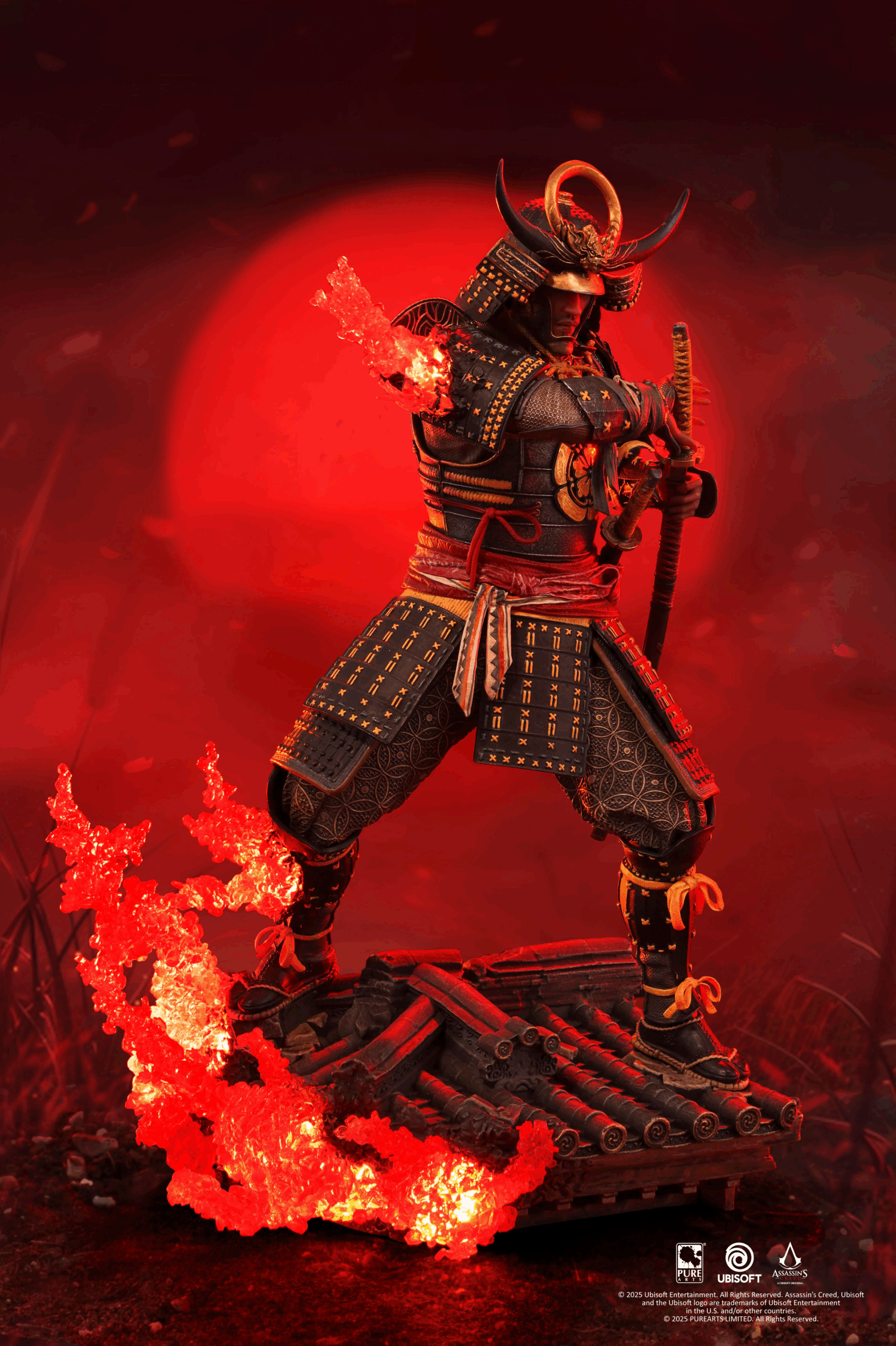 El poderoso samurái y protagonista de Assassin’s Creed Shadows, Yasuke, desenvaina su katana desde lo alto de una base inspirada en un tejado tenshu. A su lado izquierdo se manifiesta el característico efecto Animus iluminado con LED, representando el puente entre pasado y presente.