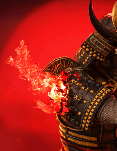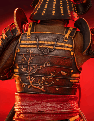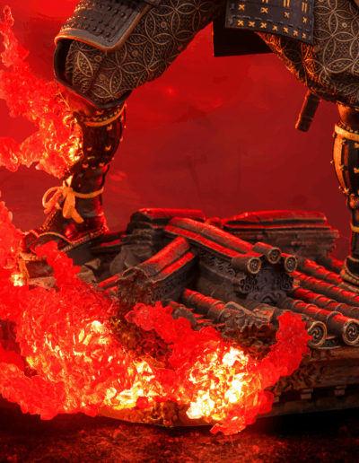 El poderoso samurái y protagonista de Assassin’s Creed Shadows, Yasuke, desenvaina su katana desde lo alto de una base inspirada en un tejado tenshu. A su lado izquierdo se manifiesta el característico efecto Animus iluminado con LED, representando el puente entre pasado y presente.
