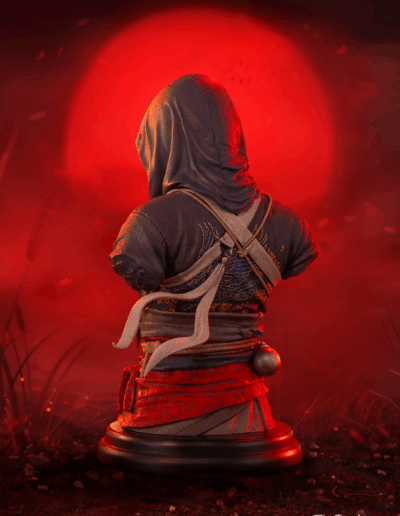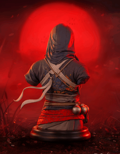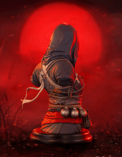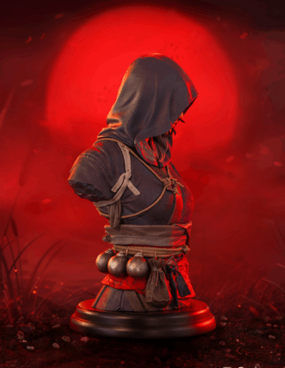 La intrépida Asesina Naoe está lista para defender a su pueblo y dar inicio a una nueva era para Japón. Este busto captura su determinación y fuerza interior, con un esculpido detallado de su atuendo tradicional shinobi y el emblema de su clan en la espalda, símbolo de su herencia y lealtad inquebrantable.