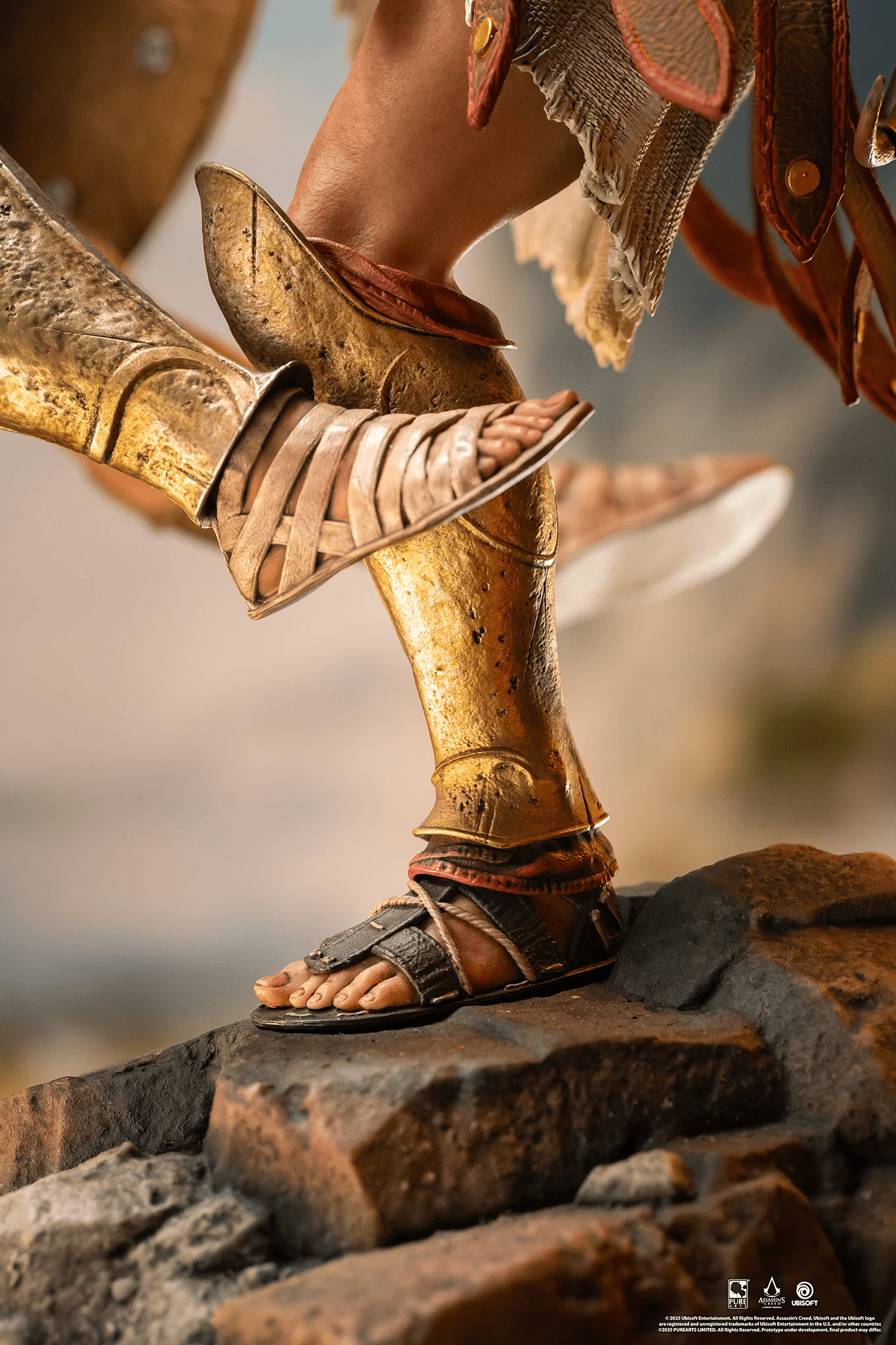 El guerrero espartano Alexios ejecuta su legendaria patada espartana contra un comandante ateniense, enviándolo por los aires. Ataviado con su atuendo de mercenario fiel al videojuego, Alexios planta su pie izquierdo sobre un terreno rocoso mientras sostiene la lanza rota de Leónidas en una mano y su kopis en la otra. La base, inspirada en la arquitectura de la Antigua Grecia, está adornada con el emblema dorado de Assassin’s Creed Odyssey.