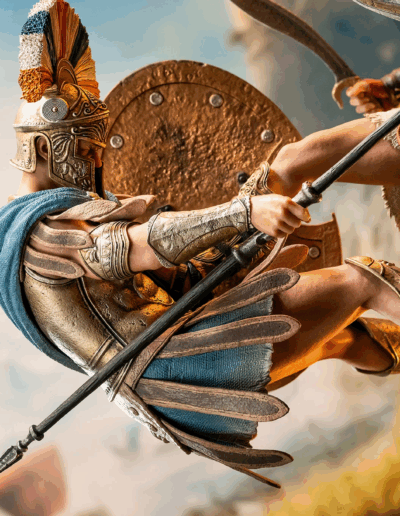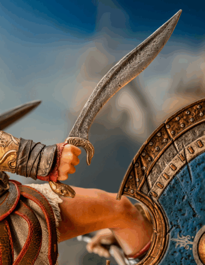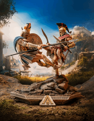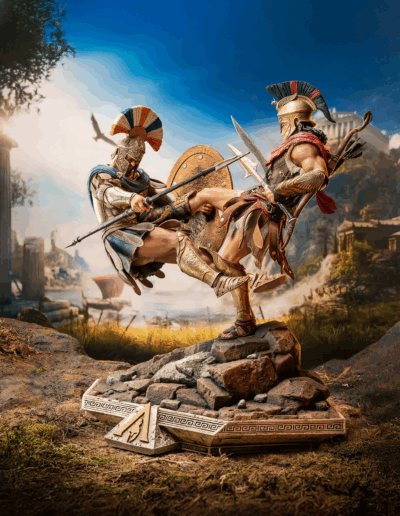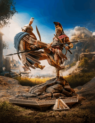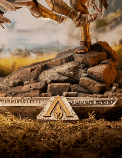 El guerrero espartano Alexios ejecuta su legendaria patada espartana contra un comandante ateniense, enviándolo por los aires. Ataviado con su atuendo de mercenario fiel al videojuego, Alexios planta su pie izquierdo sobre un terreno rocoso mientras sostiene la lanza rota de Leónidas en una mano y su kopis en la otra. La base, inspirada en la arquitectura de la Antigua Grecia, está adornada con el emblema dorado de Assassin’s Creed Odyssey.